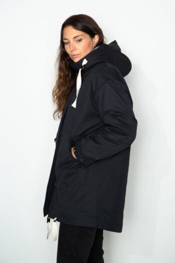Large tailored collar and double-breasted closure: an iconic. structured. and protective silhouette.