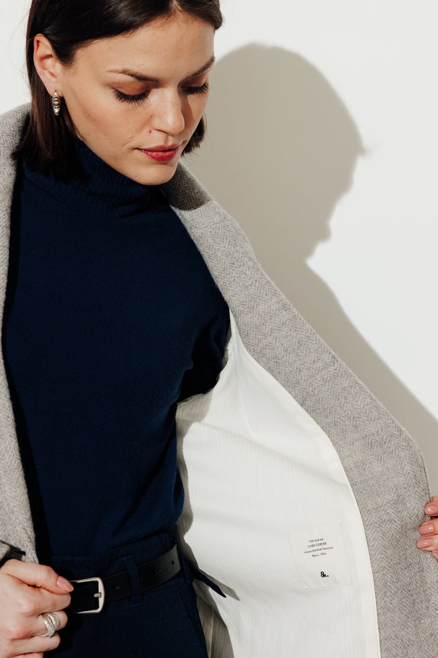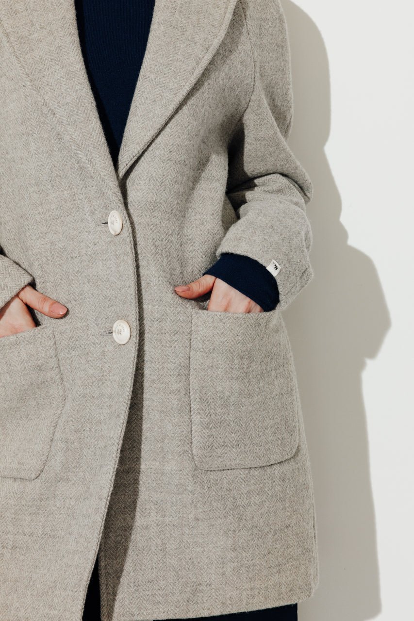 A cool elegance. a luxurious fabric: this gray herringbone coat in virgin wool embodies minimalist winter chic.