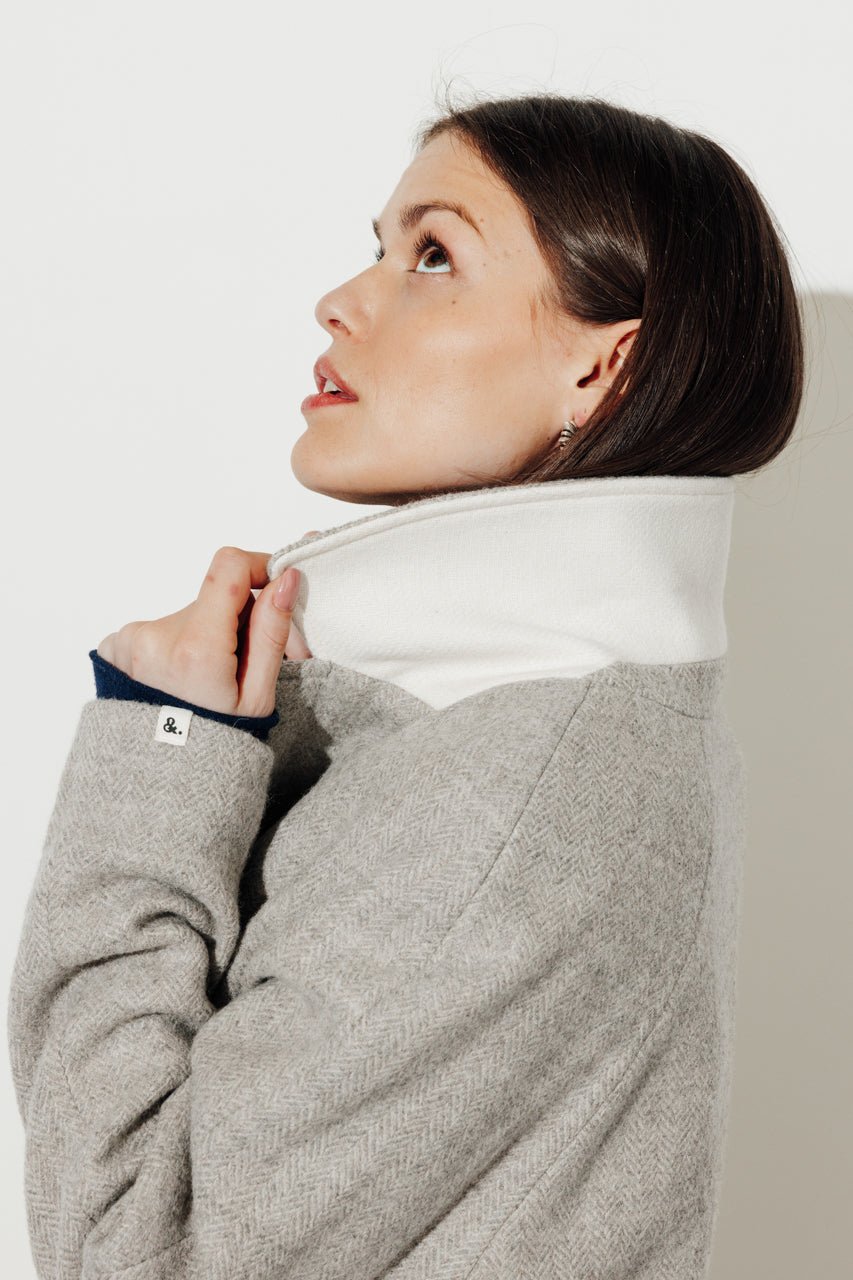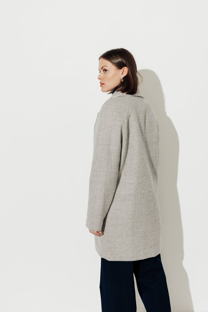 100% virgin wool herringbone fabric: soft. naturally warm. and with a beautiful drape.