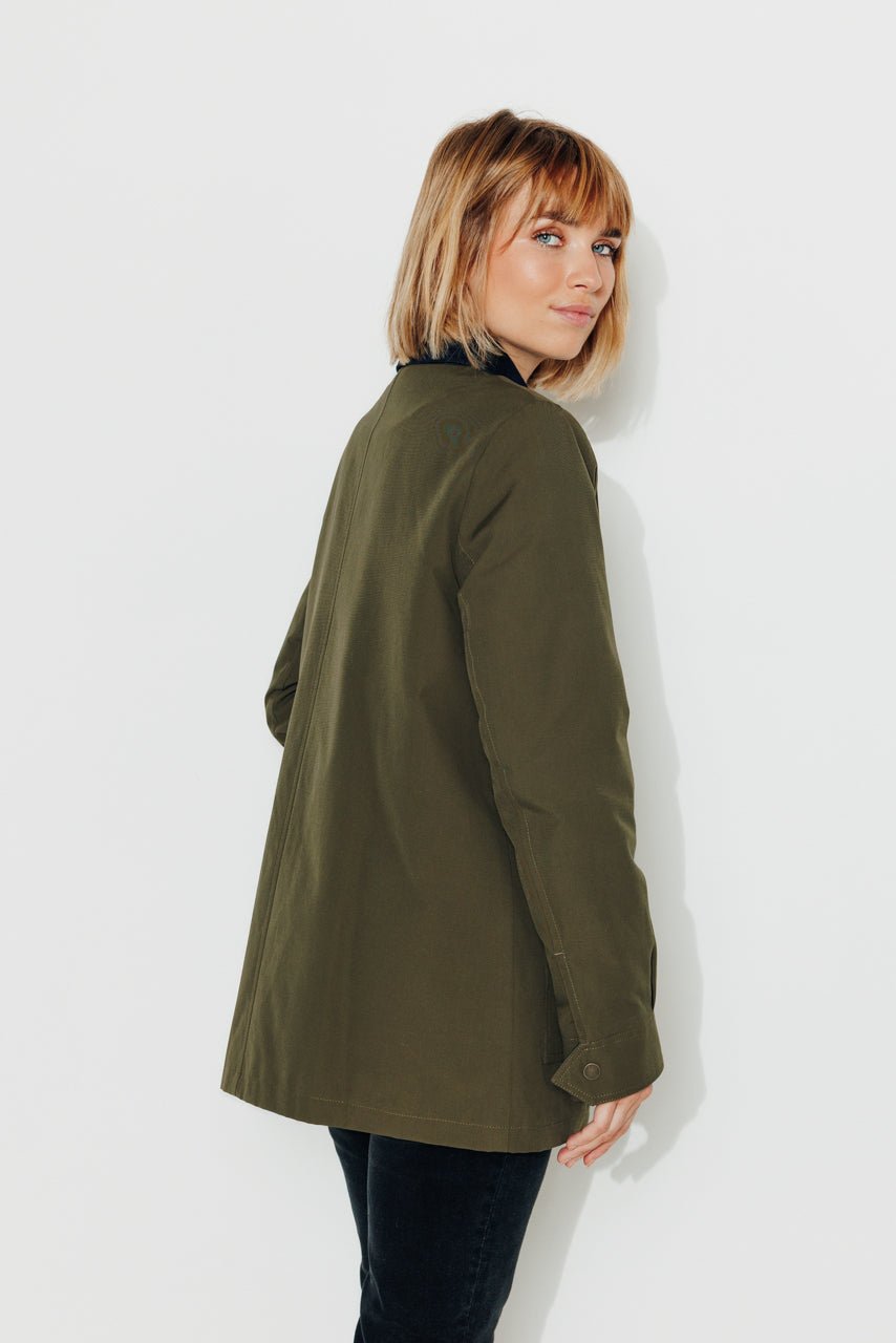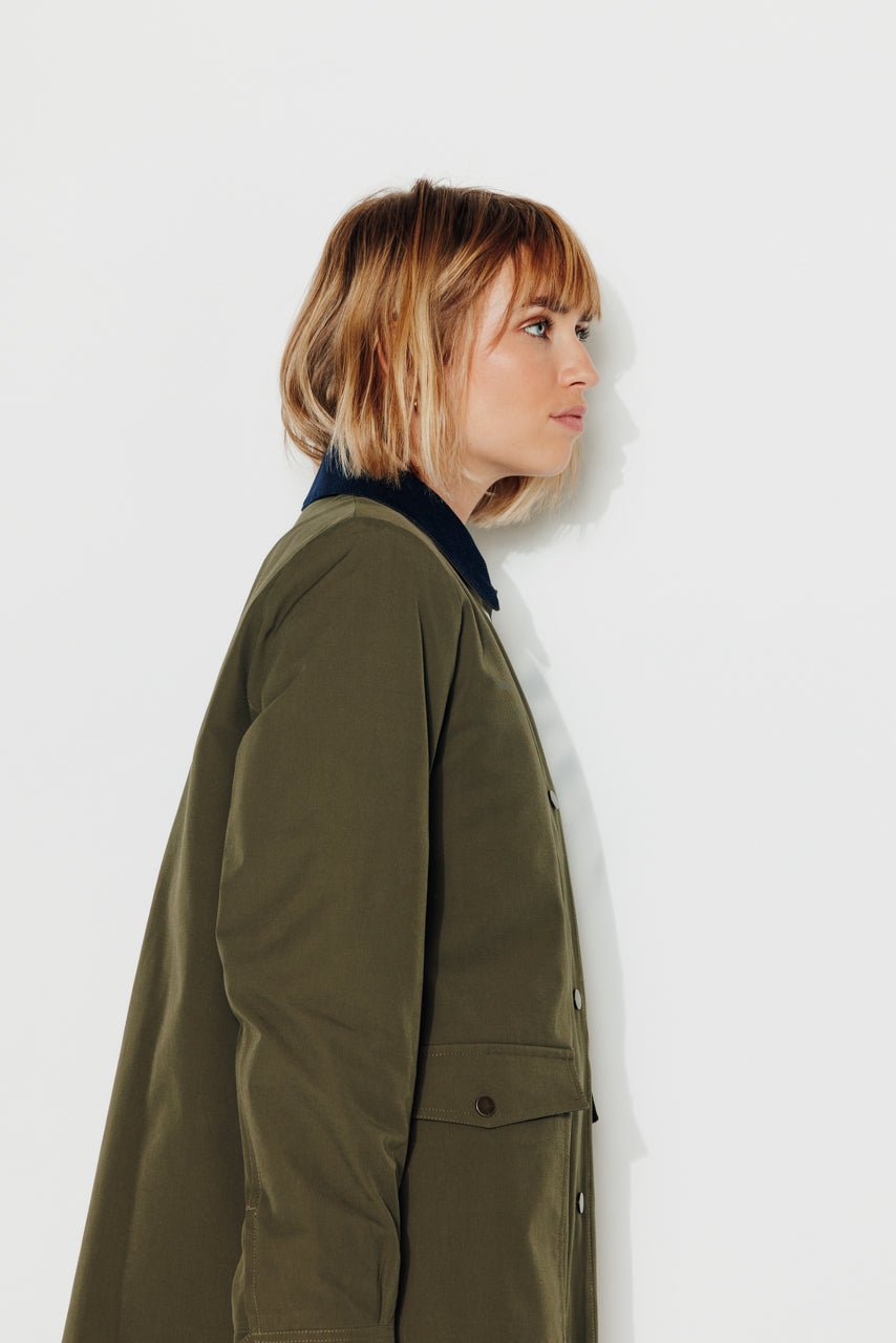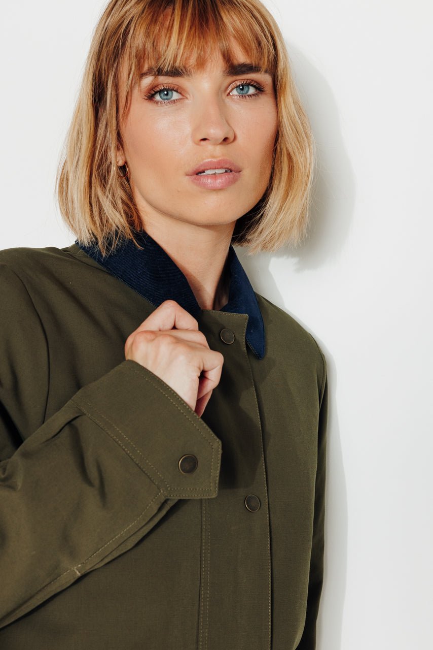 Chic and structured. the Valdisère short trench coat features a feminine cut and refined details. Its timeless khaki shade and contrasting accents make it the perfect companion for mid-season weather.