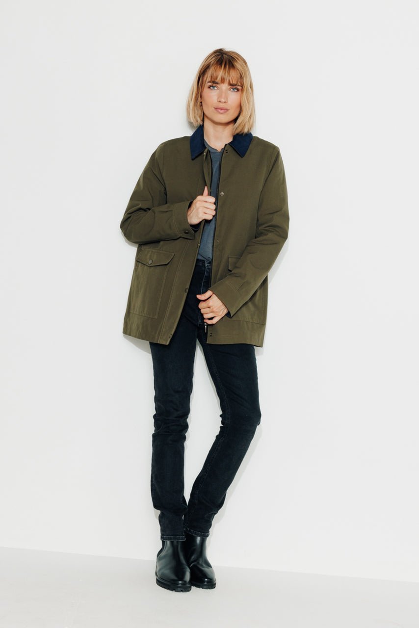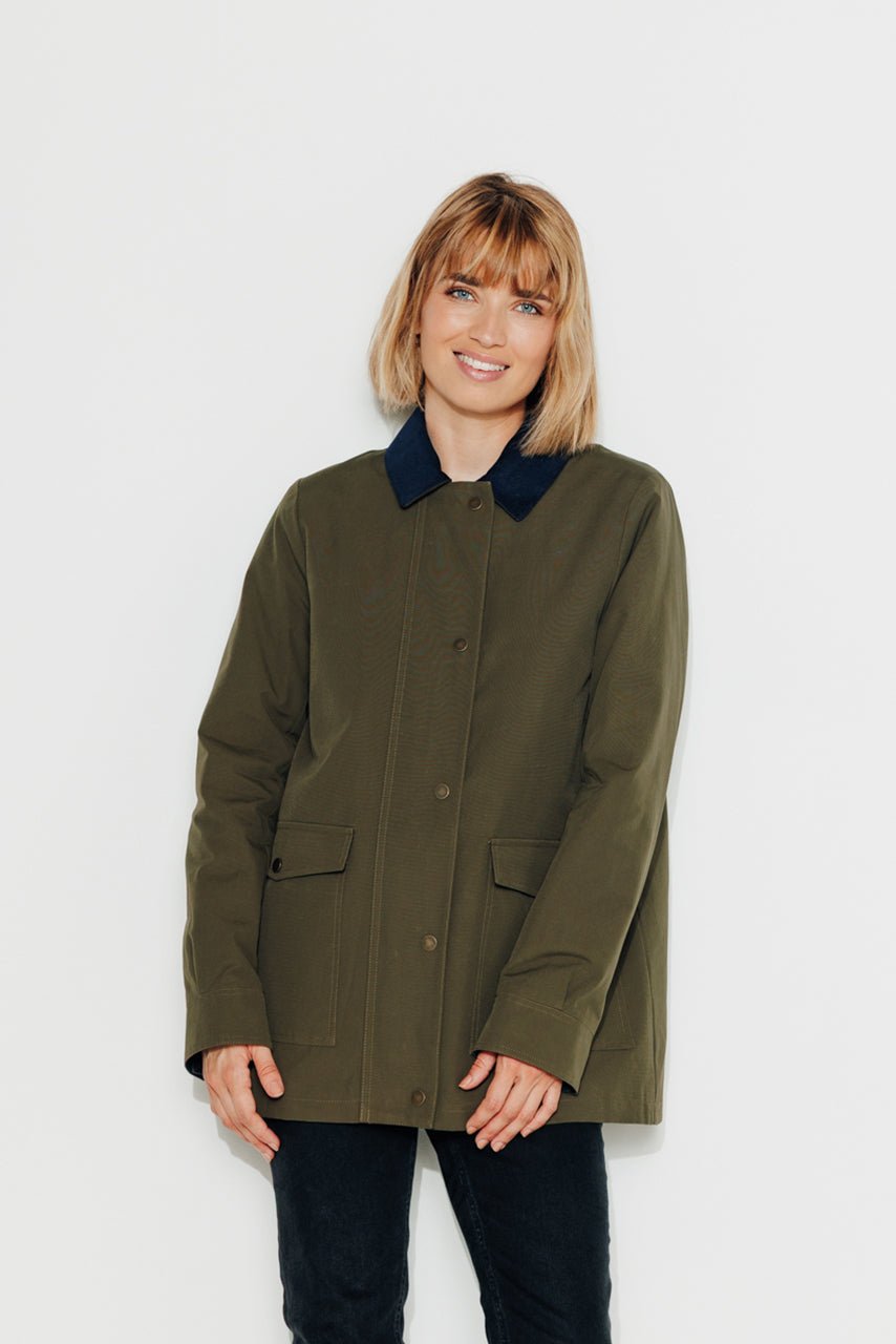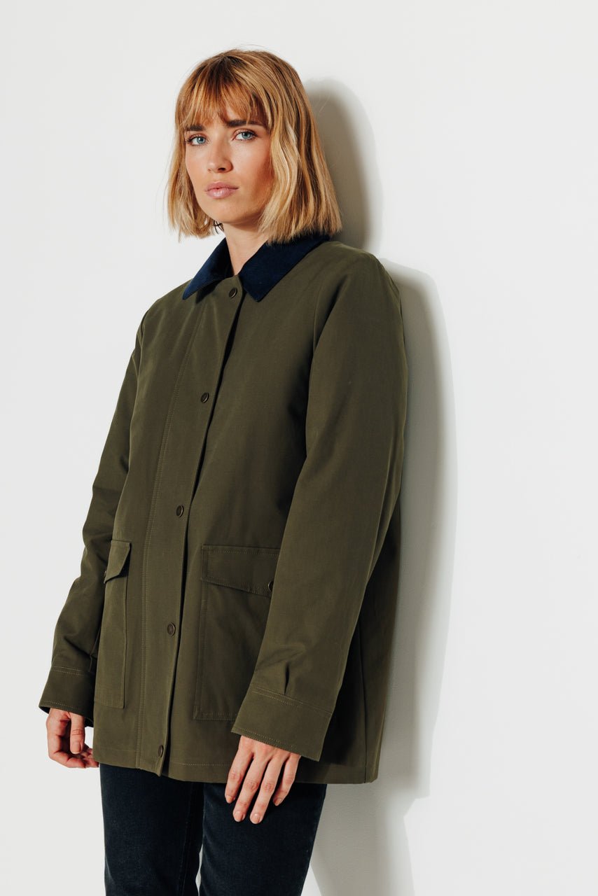 Chic and structured. the Valdisère short trench coat features a feminine cut and refined details. Its timeless khaki shade and contrasting accents make it the perfect companion for mid-season weather.