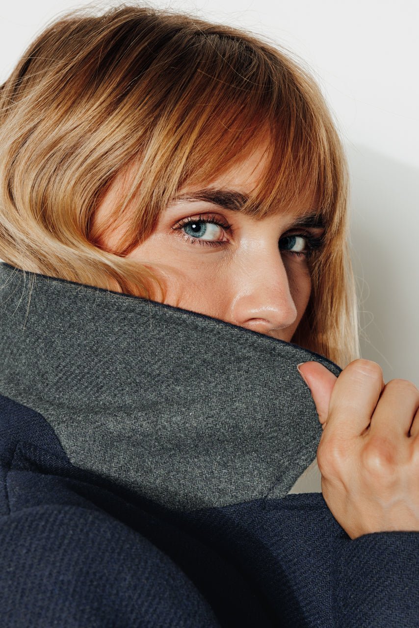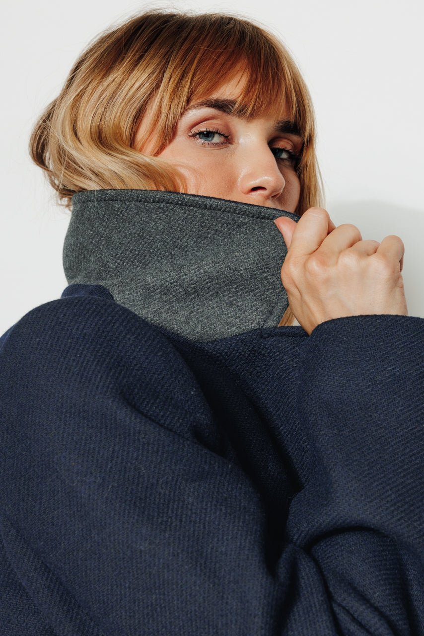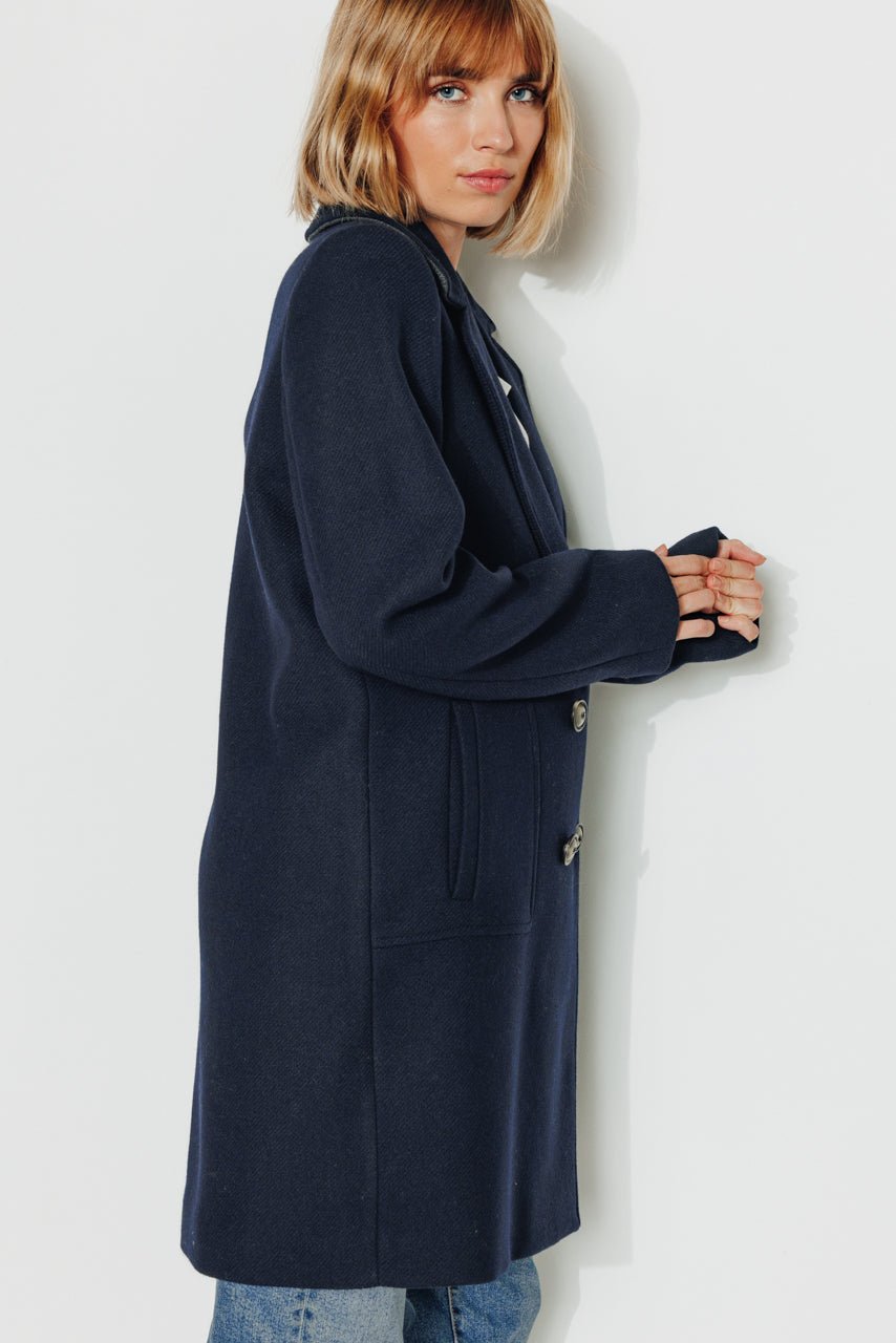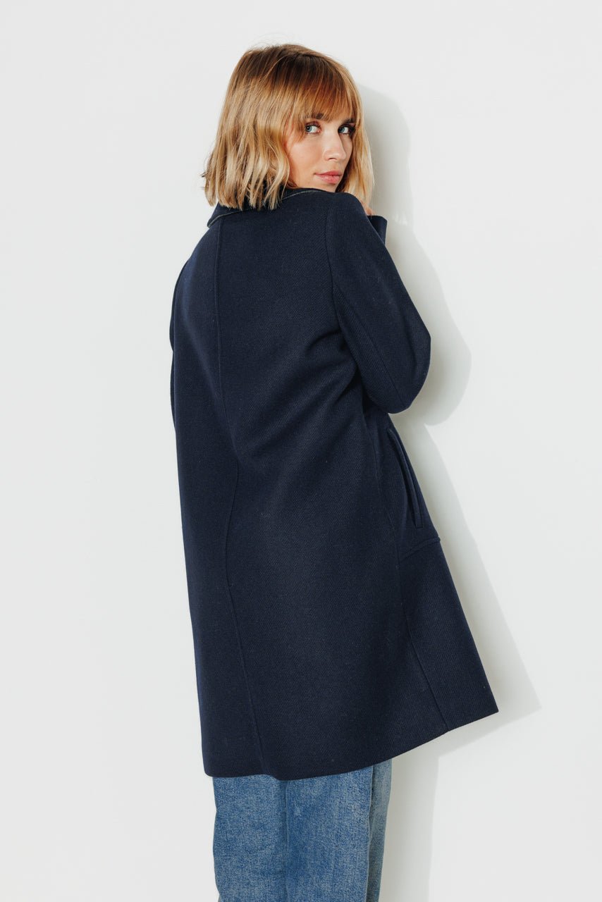 In a timeless navy blue. this long pea coat reinvents winter elegance with character and comfort.