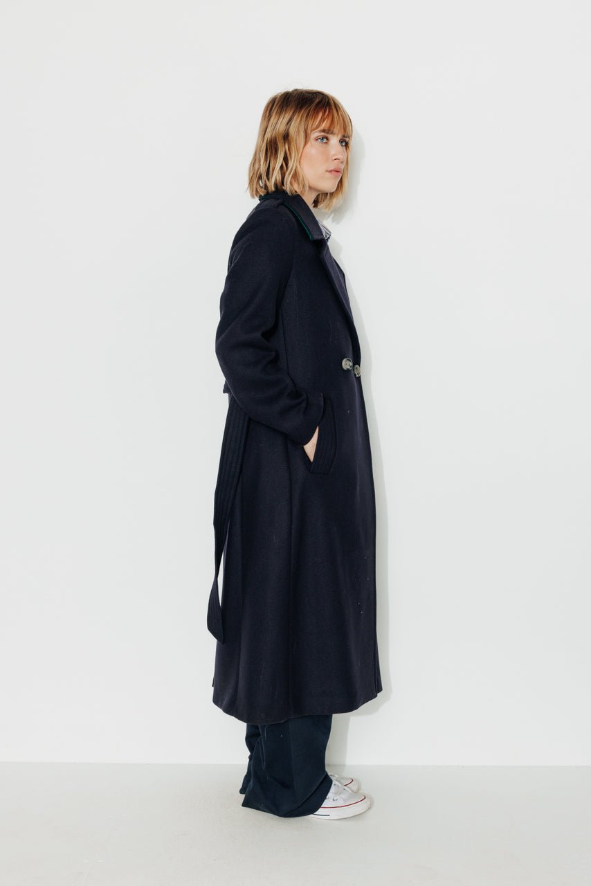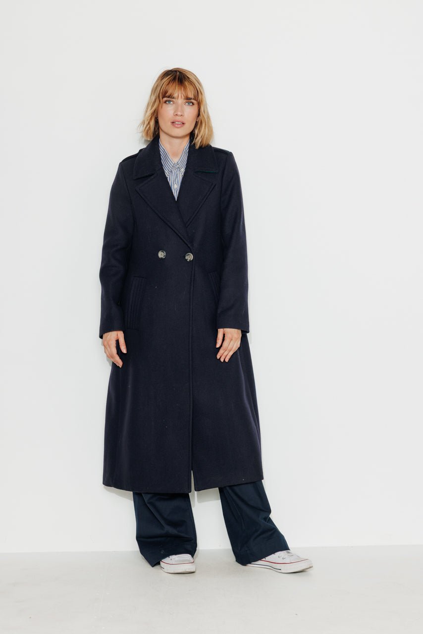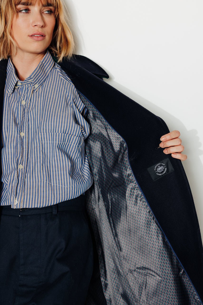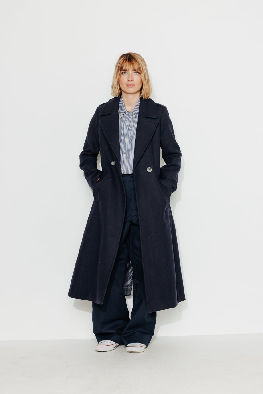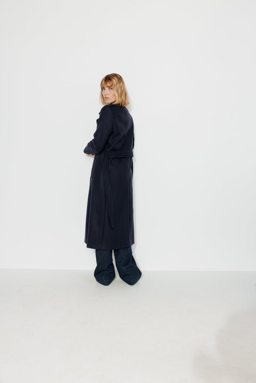 For an elegant and sophisticated look. opt for our long belted coat in navy blue virgin wool. Its belt adds a touch of femininity to your silhouette.