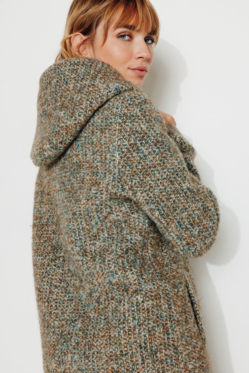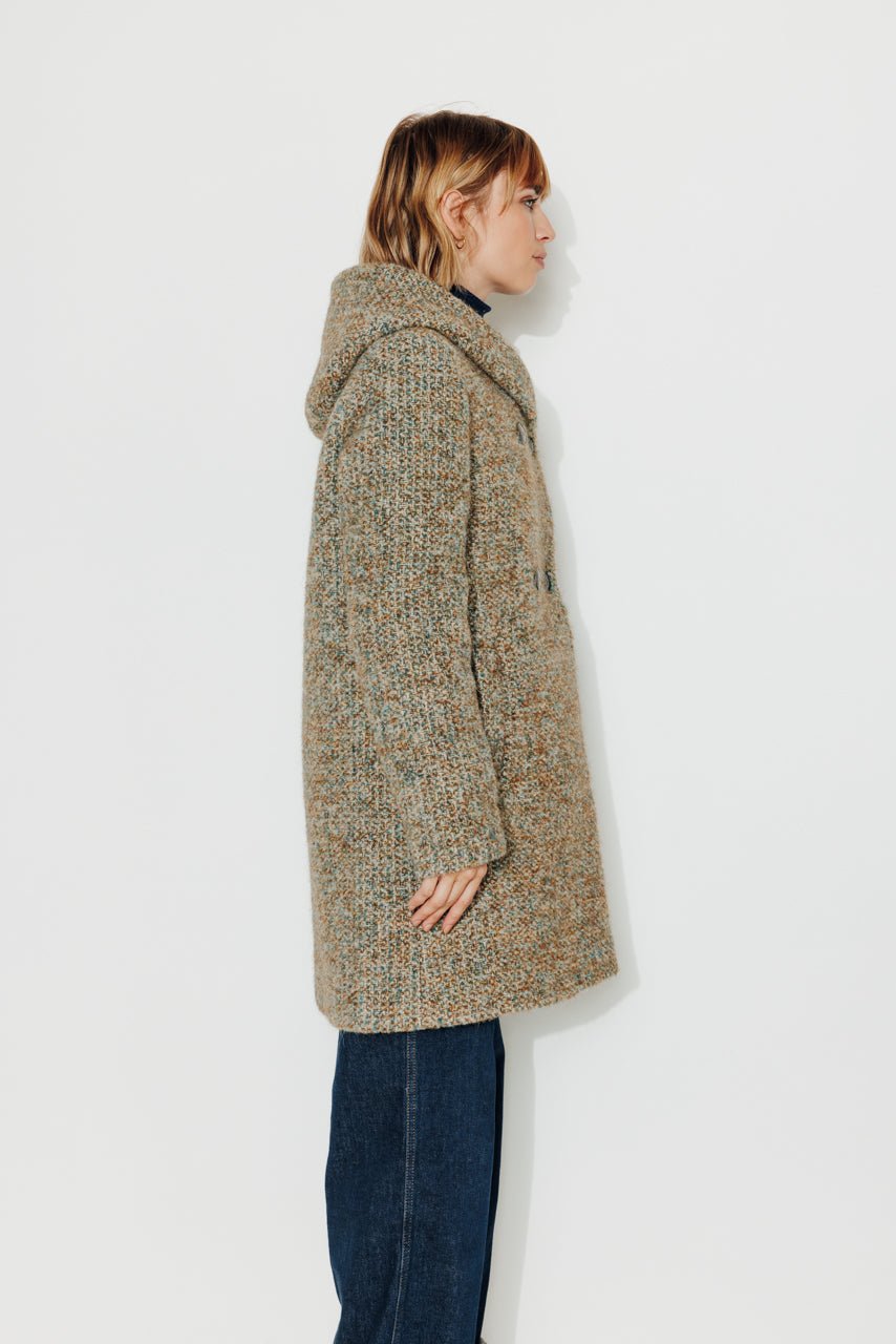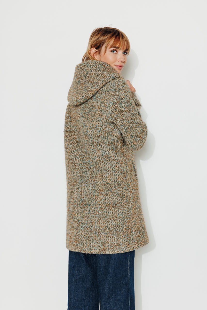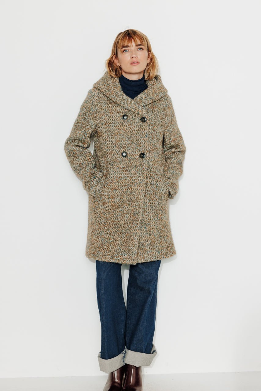 This hooded coat in virgin wool and alpaca tweed is one of the coziest coats in the collection. With its generous hood and voluminous cut. it provides comfort and warmth without compromising on style.